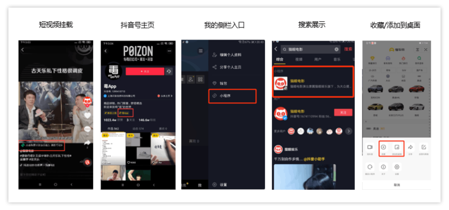抖音生态开放的小程序入口有:短视频、直播、企业主页、搜索、私信、评论、收藏、扫一扫等80多个流量入口来满足商家线上线下全场景使用